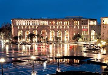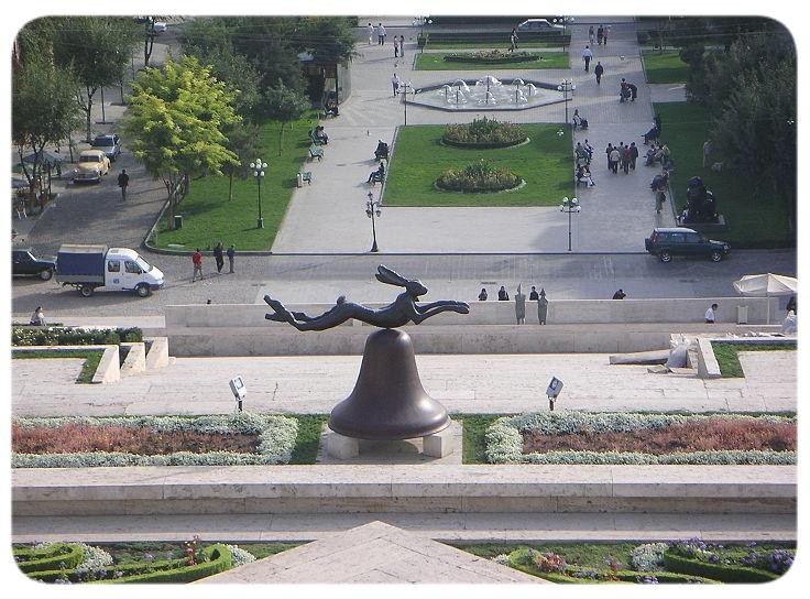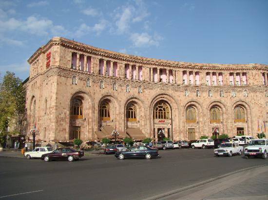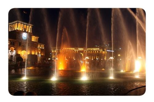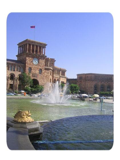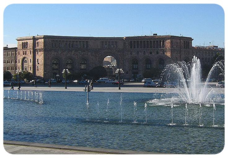 The square has a stone pattern in the center, meant to look like a traditional Armenian rug from above. The square has a large fountain in front of the National Art Gallery and History Museum, it has the Marriot Hotel, the Foreign Ministry, a post office and other establishments around it.