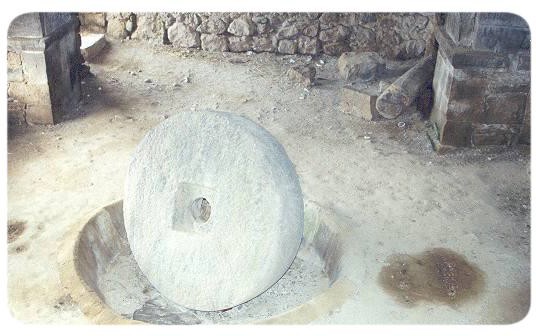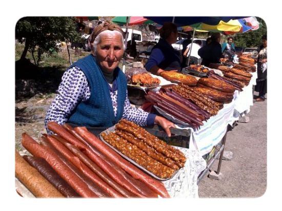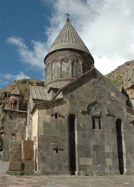 The monastery was famous because of the relics that it housed. The most celebrated of these was the spear which has wounded Christ on the Cross, allegedly brought there by the Apostle Thaddeus, from which comes its present name, Geghardavank (The Monastery of the Spear), first recorded in a document of 1250. Today the monastery complex is located at the end of the paved road, and the walk up from the parking lot is lined with women selling sweet bread, sheets of dried fruit(fruit lavash). sweet sujukh( grape molasses covered strings of walnuts) and various souvenirs. A group of musicians usually plays for a few seconds as visitors approach, perhaps willing to play longer for money.
