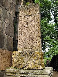 A khachkar is a cross-bearing carved memorial stele covered with rosettes and botanical motifs.