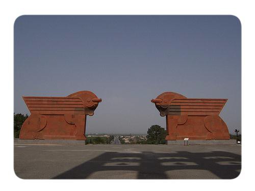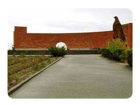 A memorial park was laid out on the battlefield in 1968. The entrance is flanked by huge winged oxen made of red tuff. A flight of steps leads to a square from which a 26-metre- high bell tower rises. The beautiful trellis structure with its nine bells can be seen from afar. The bells ring every year on the day of the historic victory, A lane of eagles, symbolizing the spirit of the fearless fighting men, leads to a curved Wall of Victory( length-55 meters, height-7 meters) with scenes of the battle, and the figure of a woman with a child – a symbol of a revival.